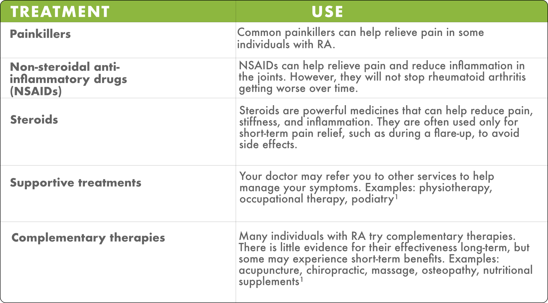 Several other treatments and approaches may be recommended, usually in combination with the other main options such as DMARDs and biologic treatments.1